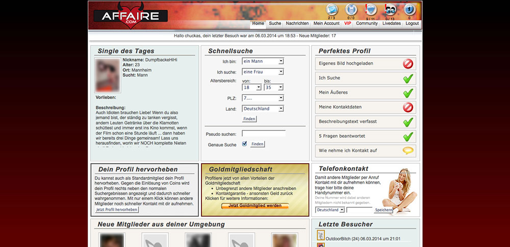Sowohl gestalterisch, als auch technisch ist Affaire.com schon merklich in die Jahre gekommen. Das letzte Redesign bzw. die letzte Generalüberholung der Seite liegt wohl schon einige Jahre zurück. Der Mitgliederbereich ist dadurch für heutige Verhältnisse relativ umständlich zu bedienen. Das Menü ist noch ganz übersichtlich. Die wichtigsten Punkte lassen sich über das Hauptmenü einfach erreichen. Aber das Design und die kleinen Menügrafiken sind einfach nicht mehr zeitgemäß. Ein geschmackvolles, erotisches Ambiente, das andere Anbieter durchaus schön umgesetzt haben, vermisst man hier komplett.