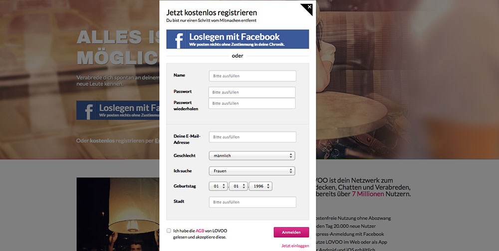 Die Anmeldung besteht aus nur einem einzigen Schritt, sodass diese tatsächlich nur wenige Sekunden dauert. Besonders unterwegs mit dem Smartphone ist es ganz angenehm, wenn man sich für die Registrierung keine halbe Stunde Zeit nehmen muss. Bei LOVOO können Sie gleich mit der Suche nach einem Flirt loslegen.