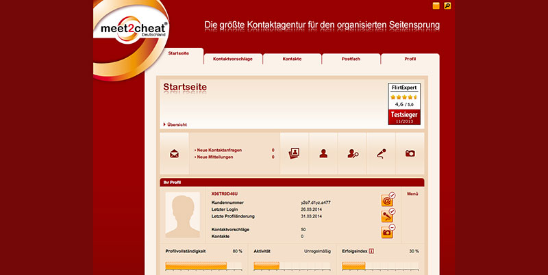 meet2cheat wirbt momentan im eigenen Mitgliederbereich mit dem Testsieg bei FlirtExpert in dem Test von November 2013.