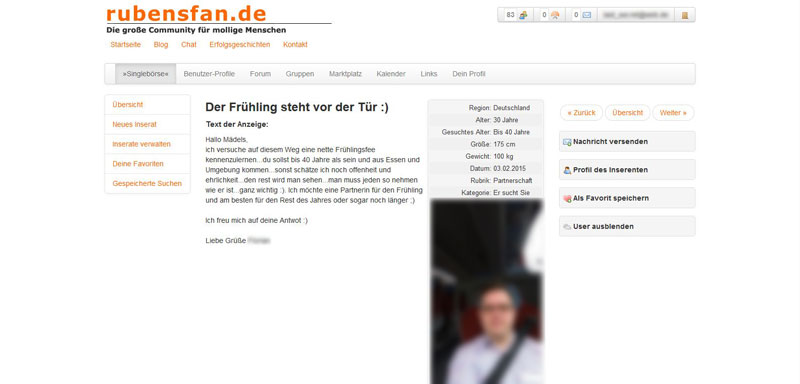 Das Design von Rubensfan ist schlicht und einfach gehalten – für eine Single-Community unserer Meinung nach etwas lieblos.